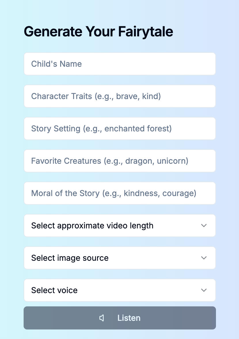 Want to create a personalized bedtime story for your little one? Our AI transforms their name, favorite traits, and magical settings into a beautifully narrated fairytale video with stunning AI-generated images.